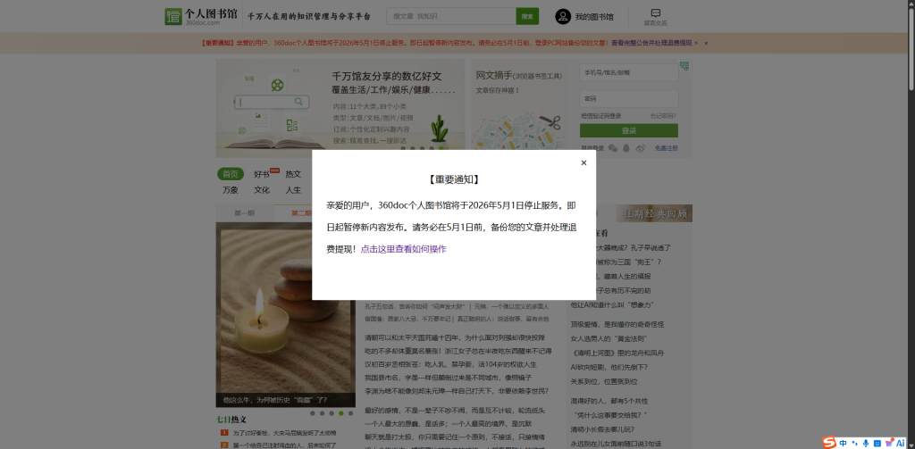因我公司业务调整,现决定:将360doc个人图书馆的全站平台资产(核心技术、数据及运营团队),向具备诚意与能力的伙伴进行无偿转让。